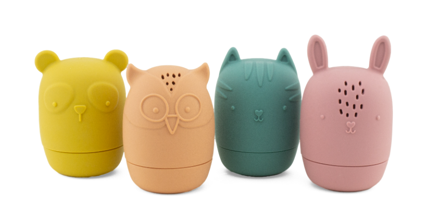 Les animaux aspergeurs sont disponibles en quatre modèles : chat, lapinou, panda et hibou, chacun dans des couleurs douces et pastel.