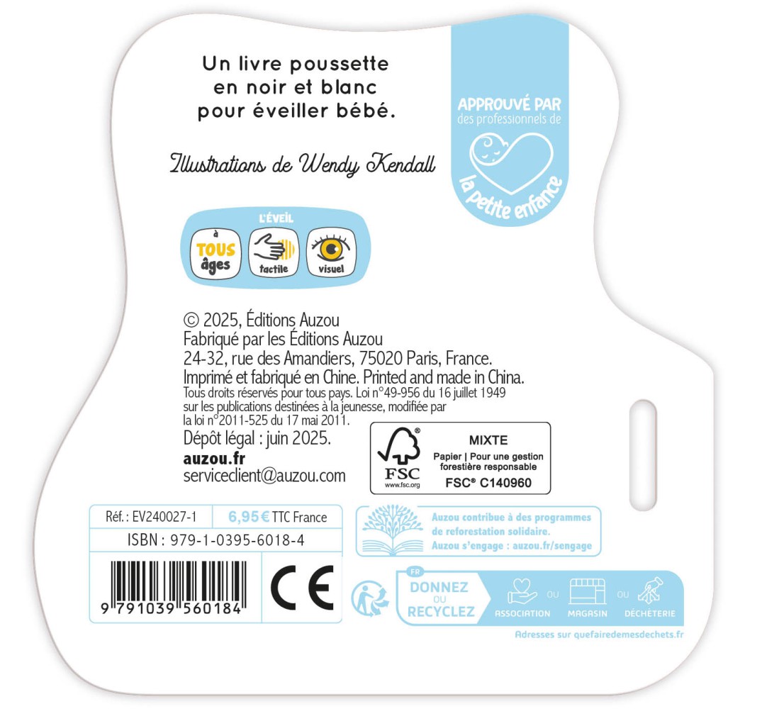 Les illustrations contrastées permettent un éveil visuel dès la naissance, et les pages en mousse colorées (accessibles à travers de petites découpes présentent sur chaque page) participent à l’éveil tactile de bébé.